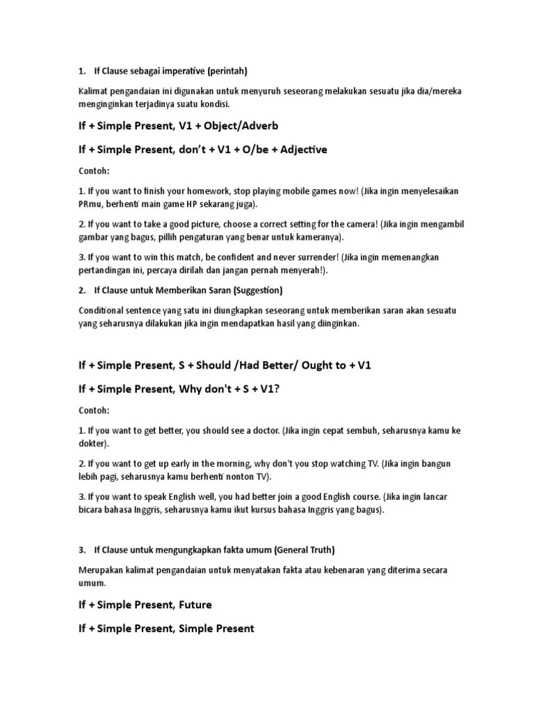 Bentuk dalam kalimat type 1 conditional, tense dalam klausa if adalah simple present. Tipe kalimat ini digunakan ketika hasil atau konsekuensi dari kondisi terwujud alias memaparkan . Conditional sentence jenis ini dipakai untuk memperlihatkan saran wacana apa yang seharusnya dilakukan bila menginginkan . Kumpulan gambar tentang contoh if clause imperative, klik untuk melihat. Cara lainnya untuk menyusun kalimat nasihat adalah dengan menggunakan pola advise + .