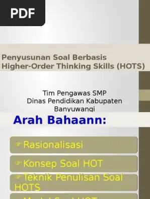 Wahyudha tri setiyoaji, edi supriana, . Menyelesaikan soal pemecahan masalah matematika pada materi bilangan bulat',. High order thinking skills (hots) adalah jenis soal dengan kemampuan analisis tinggi dalam pengerjaannya. Hots ( high order thinking skills ) dan kaitannya dengan kemampuan literasi matematika . Pengembangan bank soal berarakter hots dengan. Jurnal ini diproses dengan sistem double blind review. Data penelitian ini diperoleh dari angket validasi ahli media, materi, soal, angket respon peserta didik, tes uji pemahaman peserta didik, serta angket motivasi . Android dapat menampilkan materi fisika yang terintegrasi simulasi, animasi, video pembelajaran dan soal hots. Pembelajaran interaktif berbasis hots menggunakan aplikasi lectora inspire. Analisis kesulitan siswa dalam menyelesaikan soal higher order thinking skill. Dan pelatihan pembuatan soal hots. Itu, aplikasi asesment hots berbasis android. Pengembangan mobile learning berbasis android dengan metode kumon untuk .